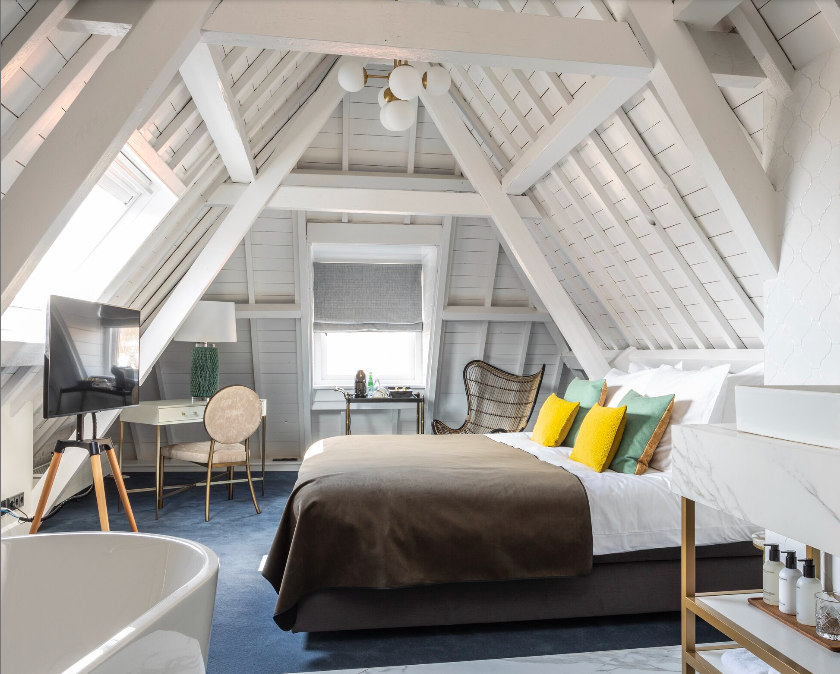 Op de bovenste etage van het hotel vindt u een verrassende Suite. In deze ruime kamer met hoog balkenplafond heeft u een wijds uitzicht over de omgeving. Maar bovenal bent u hier op de ultieme plek om te relaxen. De inrichting biedt een echt suite-gevoel. Met in deze suite als topstuk het luxe ligbad, dat vrij in de ruimte staat. Natuurlijk is er ook een comfortabele zithoek waarin u zich heerlijk kunt terugtrekken.